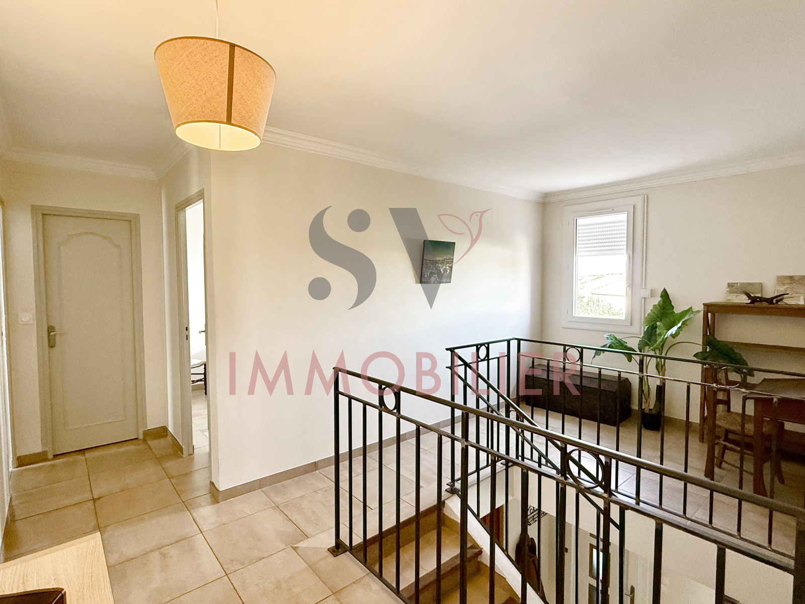 À l’étage, un palier ajouré avec coin bureau dessert trois chambres, une salle de bains et un second WC séparé, pour une organisation fonctionnelle au quotidien.