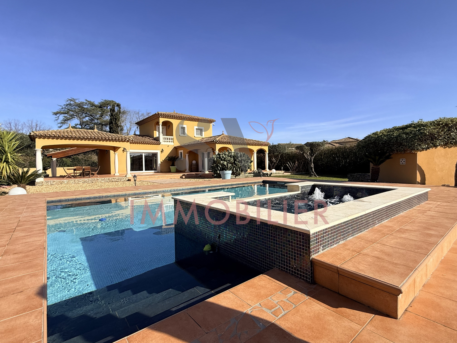 Un espace détente d'exception avec se piscine maçonnée habillée d’émaux irisés, qui s’accompagne d’un jacuzzi intégré.
