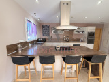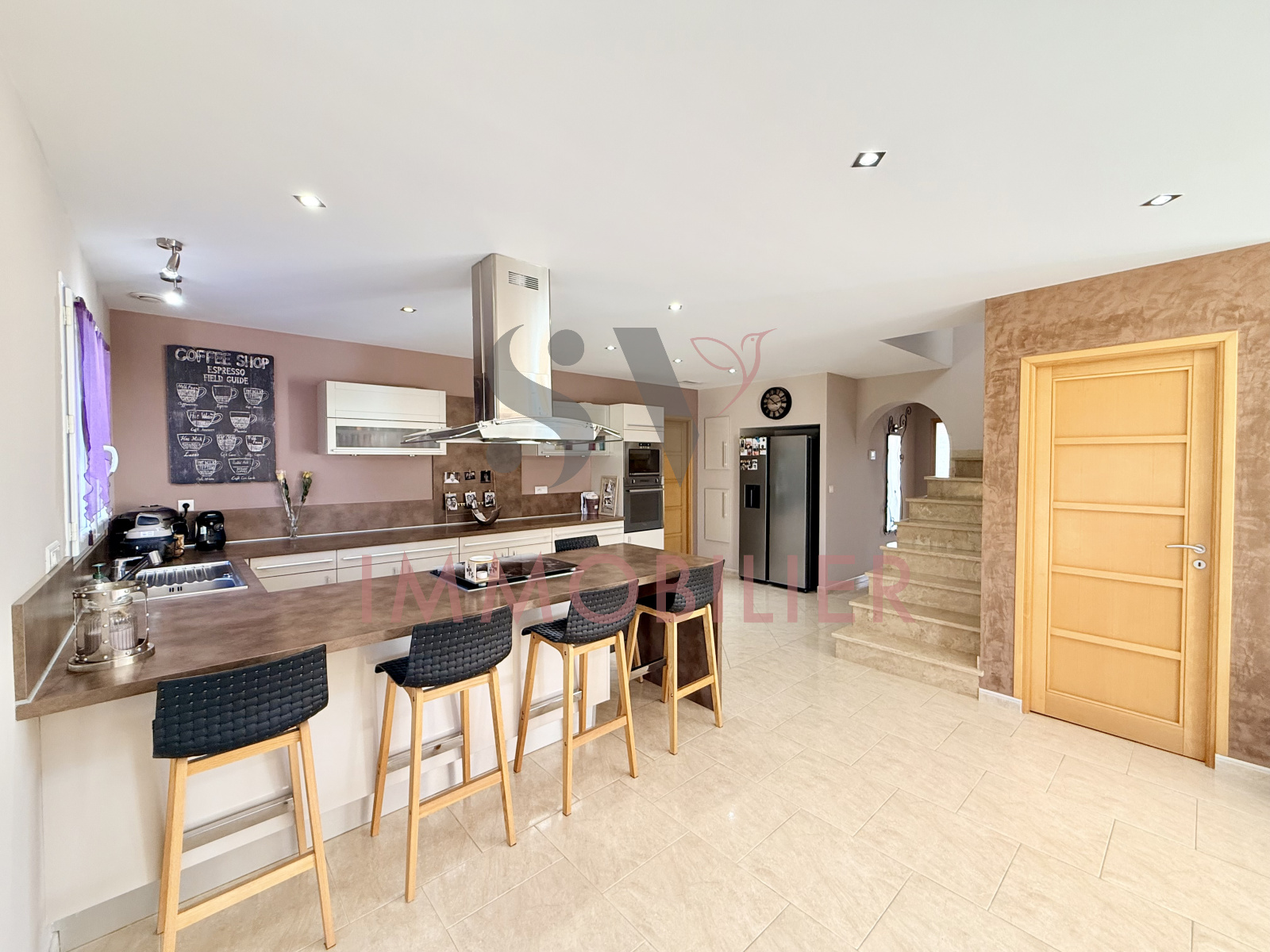 La cuisine avec îlot central prolonge cette atmosphère chaleureuse et conviviale.